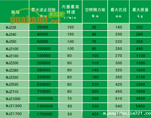 例如:代号NJZ 330-S-280,表示NJZ型接触式逆止器,额定逆止力矩为330000 N.m,内圈转向顺时针,安装孔直径280mm。